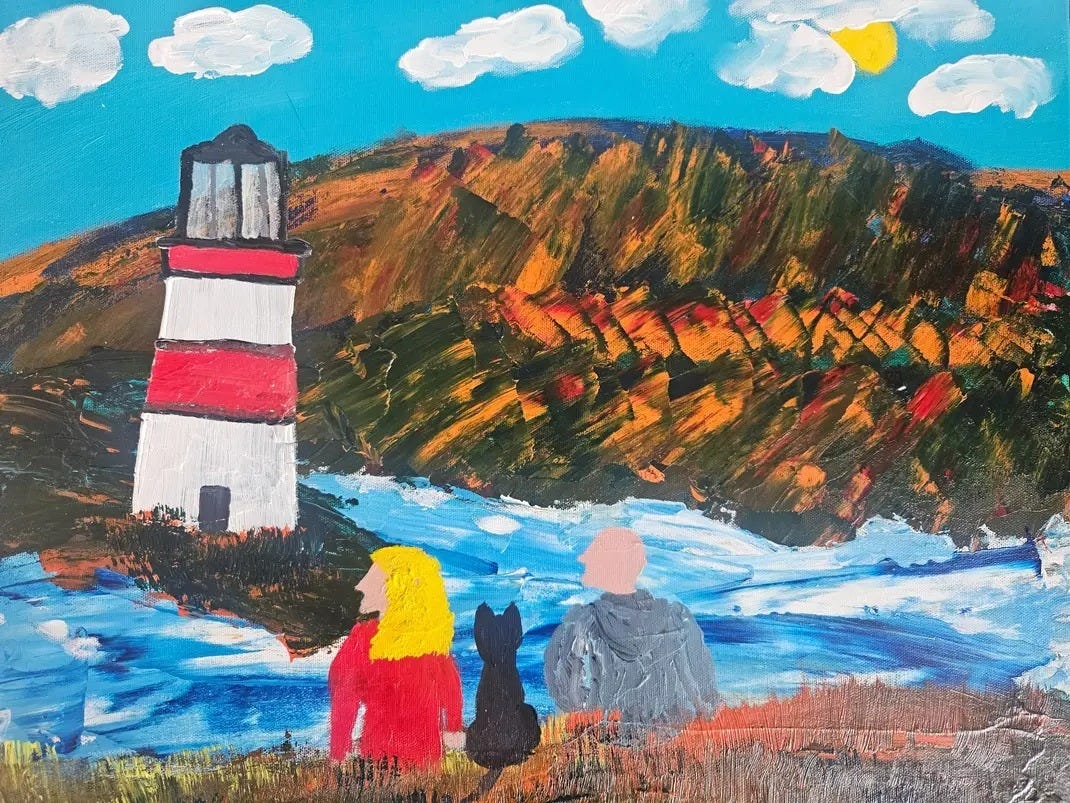Un couple et leur chat contemplent la mer, devant un vieux phare rouge et blanc.